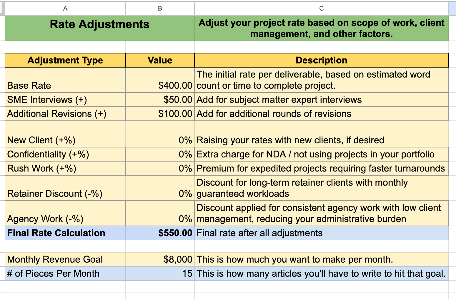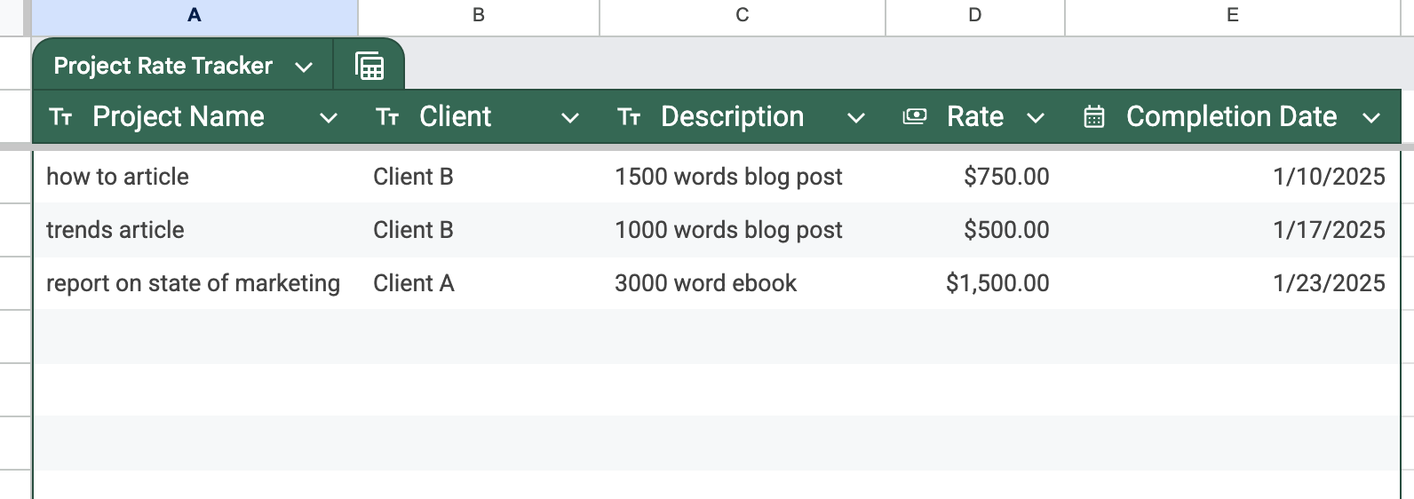 Pro tip: Set a reminder to review your Project Rate Tracker quarterly. You might notice that certain clients or types of content consistently bring in higher rates, helping you focus your pitching efforts more strategically.