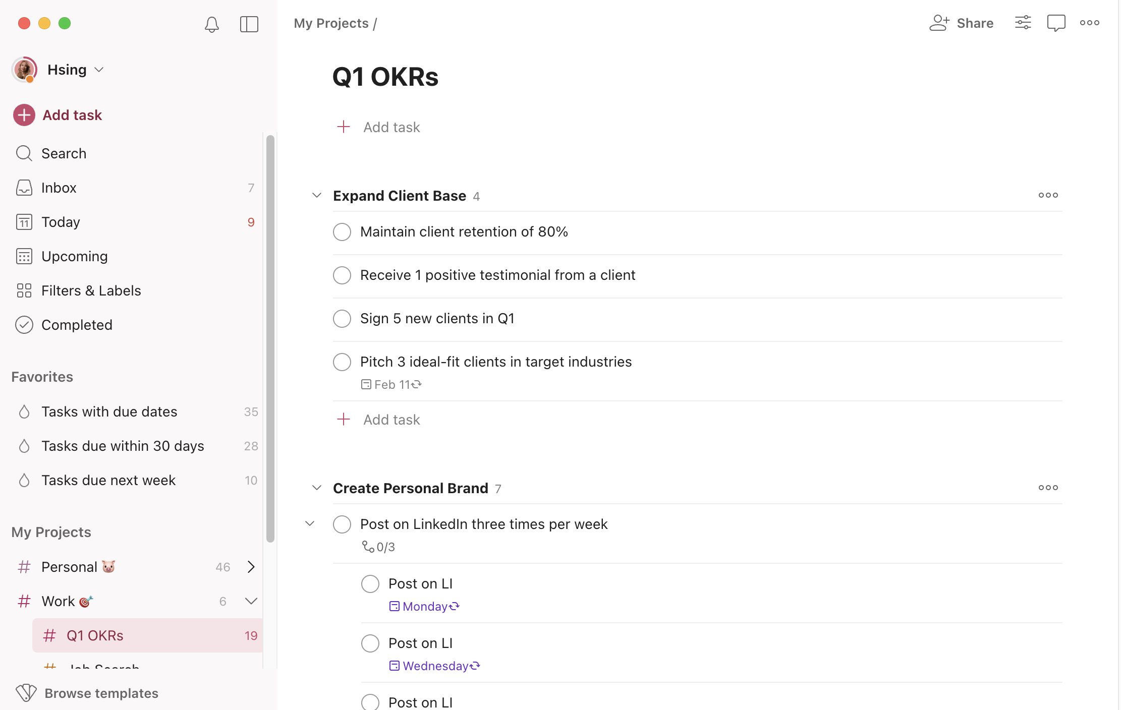 - OKR System: I’ve implemented an OKR checklist in Todoist, with recurring tasks that I can check off.