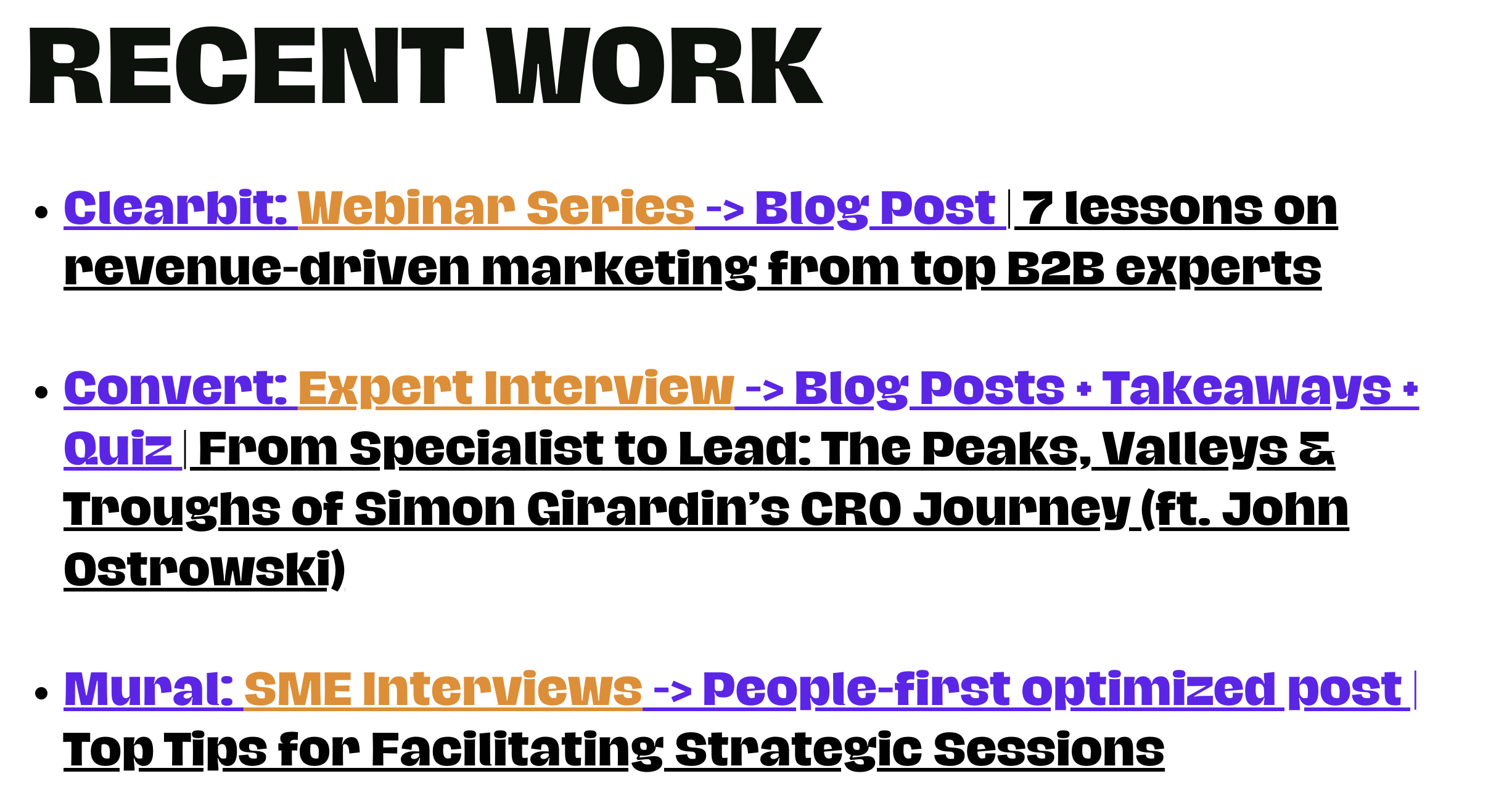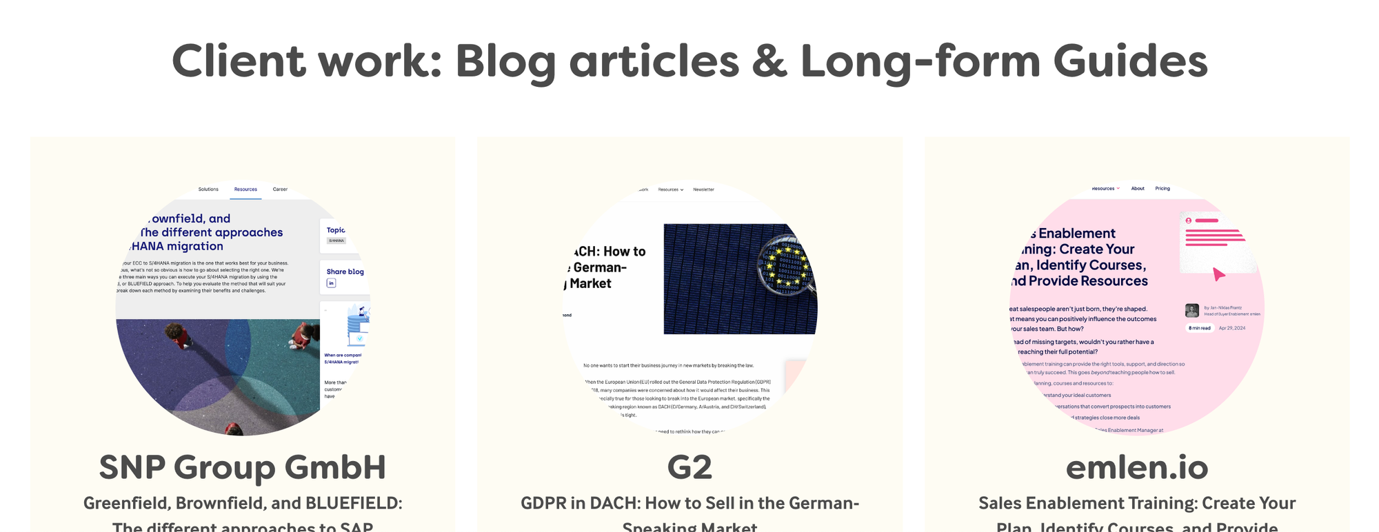 For my portfolio, I include the work that I'm most proud of, the pieces that have performed best, and the projects that reflect the type of work I specialize in (journalistic, interview-led articles and data-driven reports for B2B SaaS)