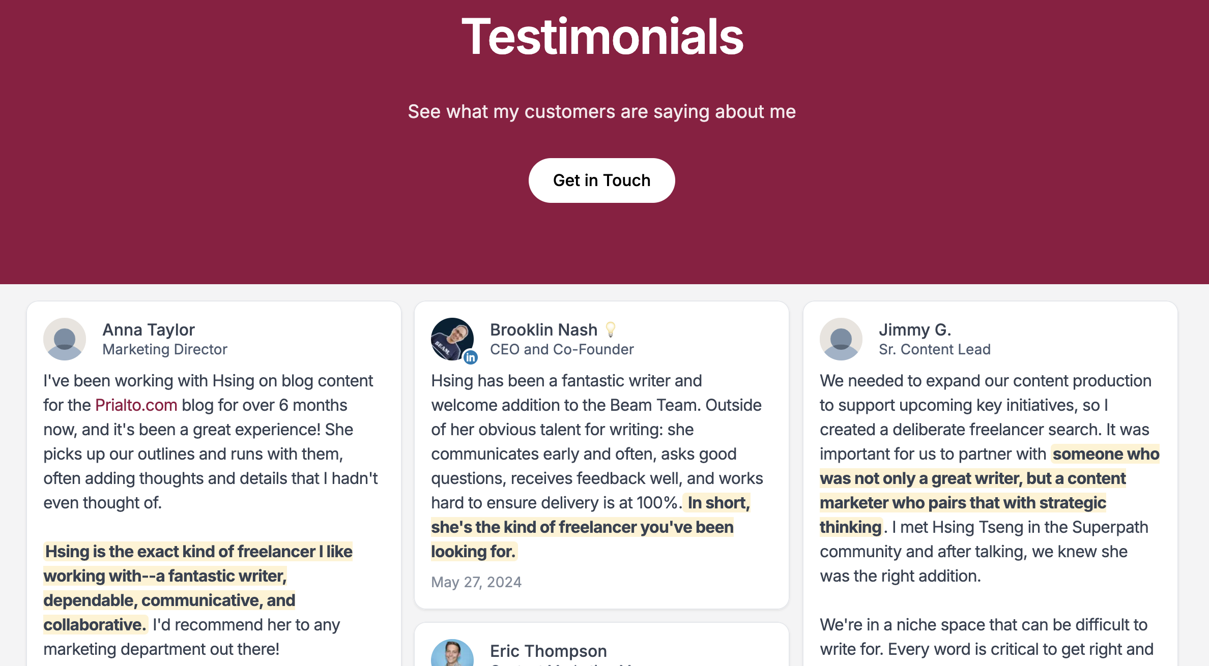 "Collect and add as many testimonials as you can," says Nupur. "It doesn't even have to be proper testimonials. Client praised you for your exceptional project management skills? Add it. A LinkedIn comment about how your writing set the standard? It goes there too. Every little validation matters. So, don't shy away from showing it to the world. You never know who might be paying attention."