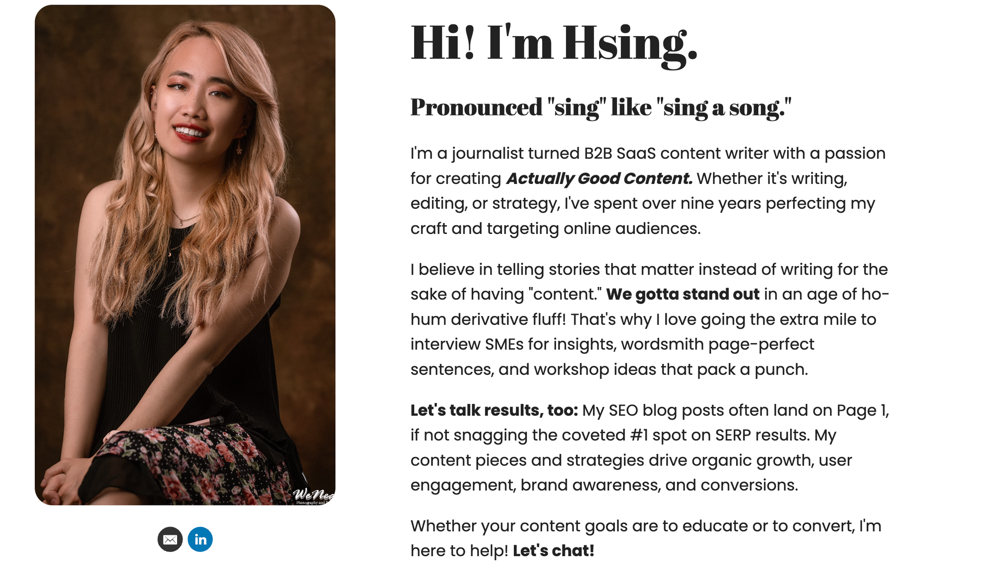 - What type of writing you specialize in (Is it short-form copywriting? Long-form content writing? SEO writing? Ghostwriting? etc.)