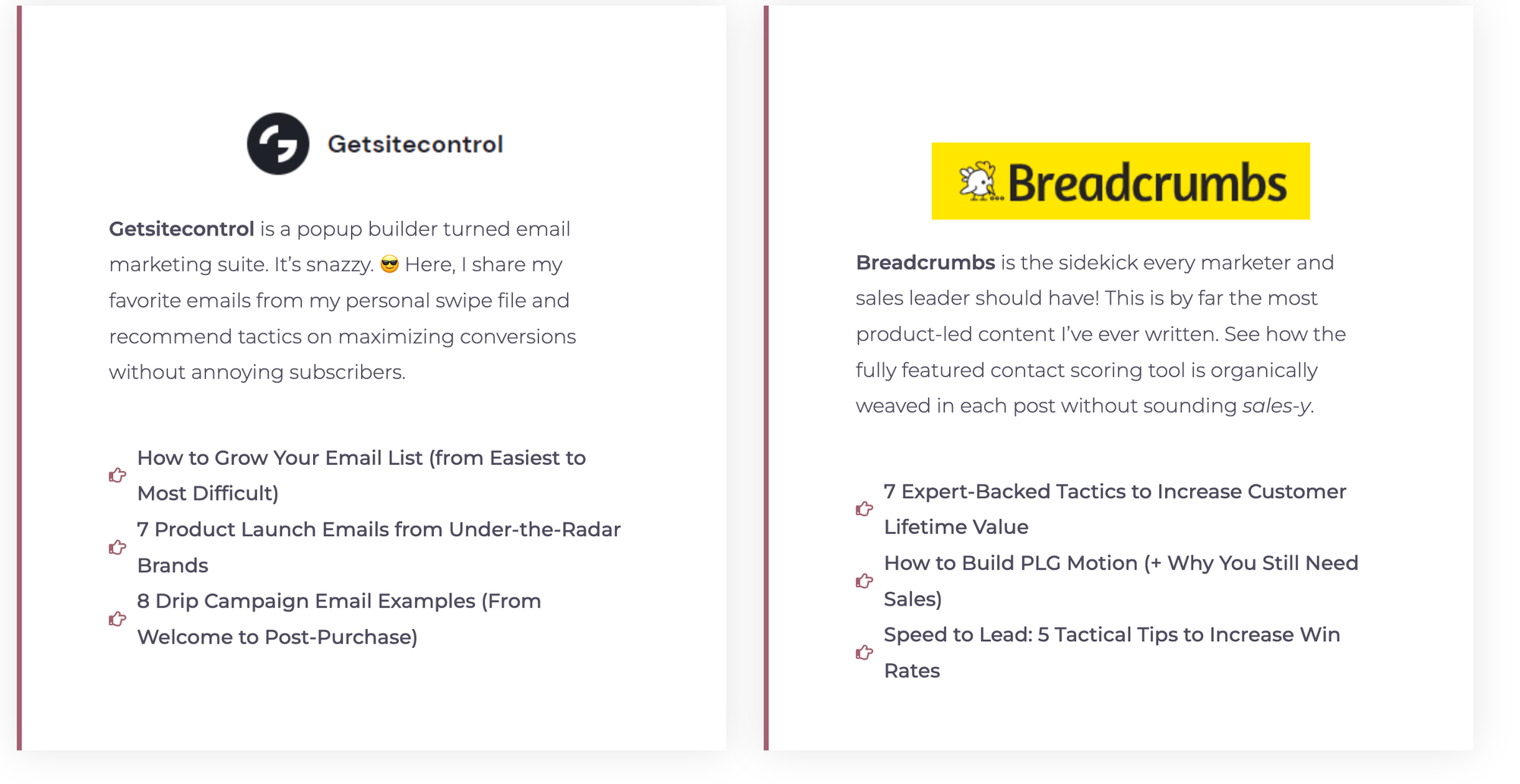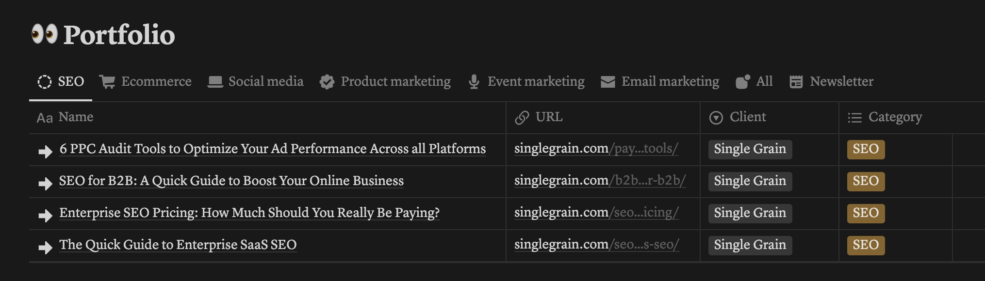 "Definitely categorize your portfolio in some way. Mine is split between blog posts & long-form guides and case studies & customer success stories," Belinda says. "If you write for several niches, you could also split additionally by niche."