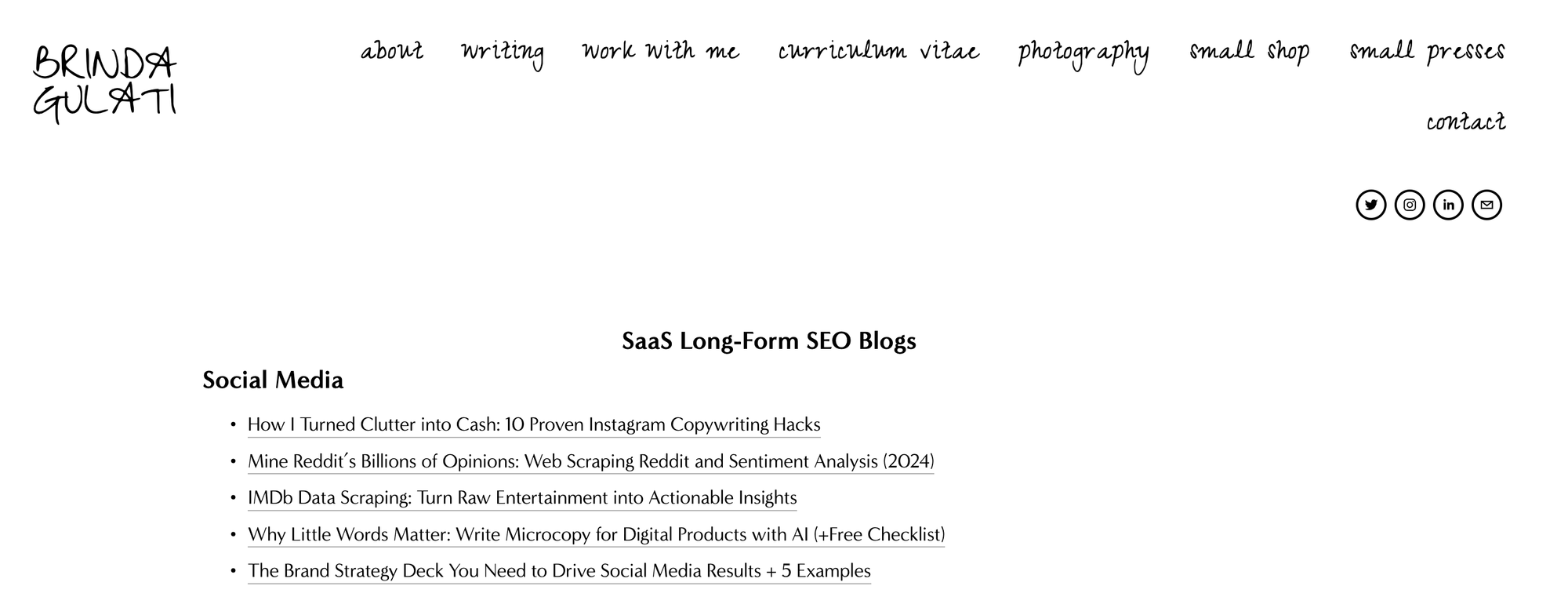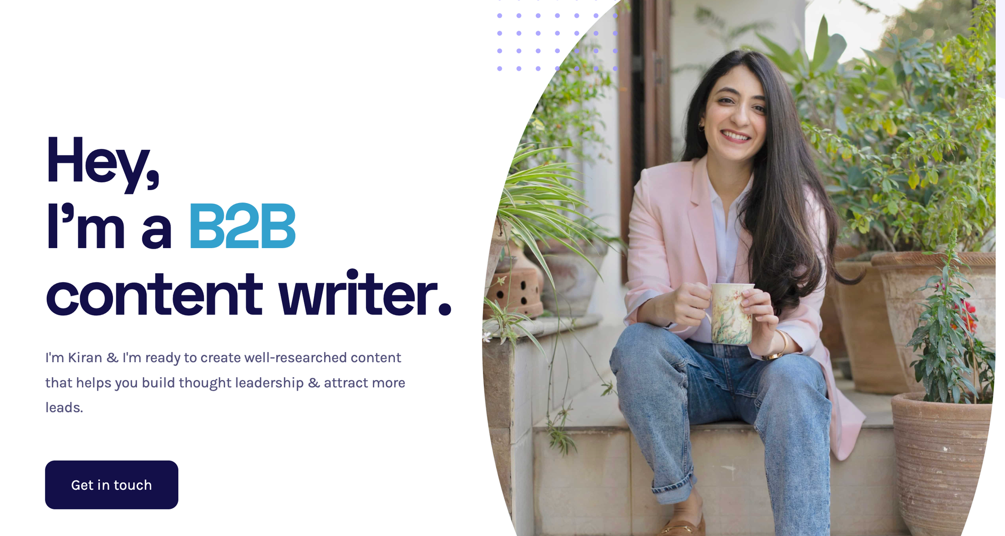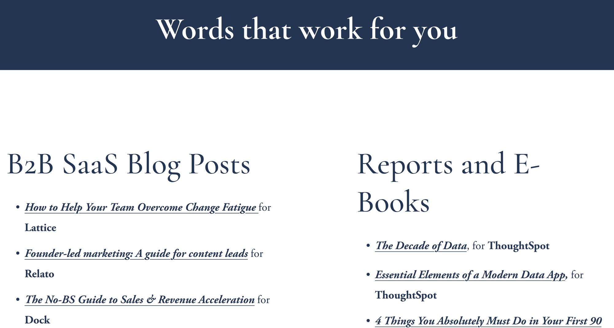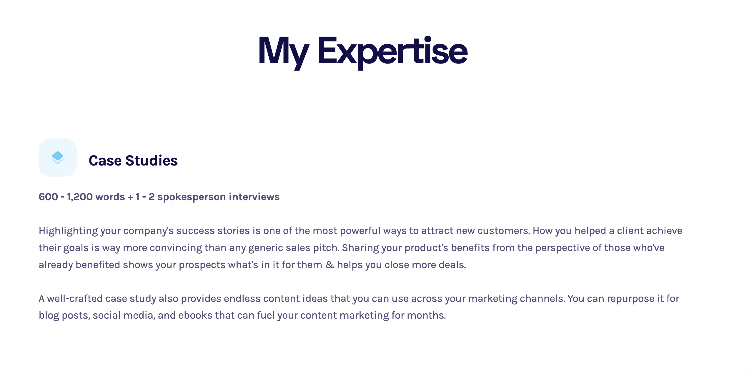 On her home page, Kiran talks about the three kinds of deliverables she creates: blog posts, case studies, and ebooks/whitepapers.