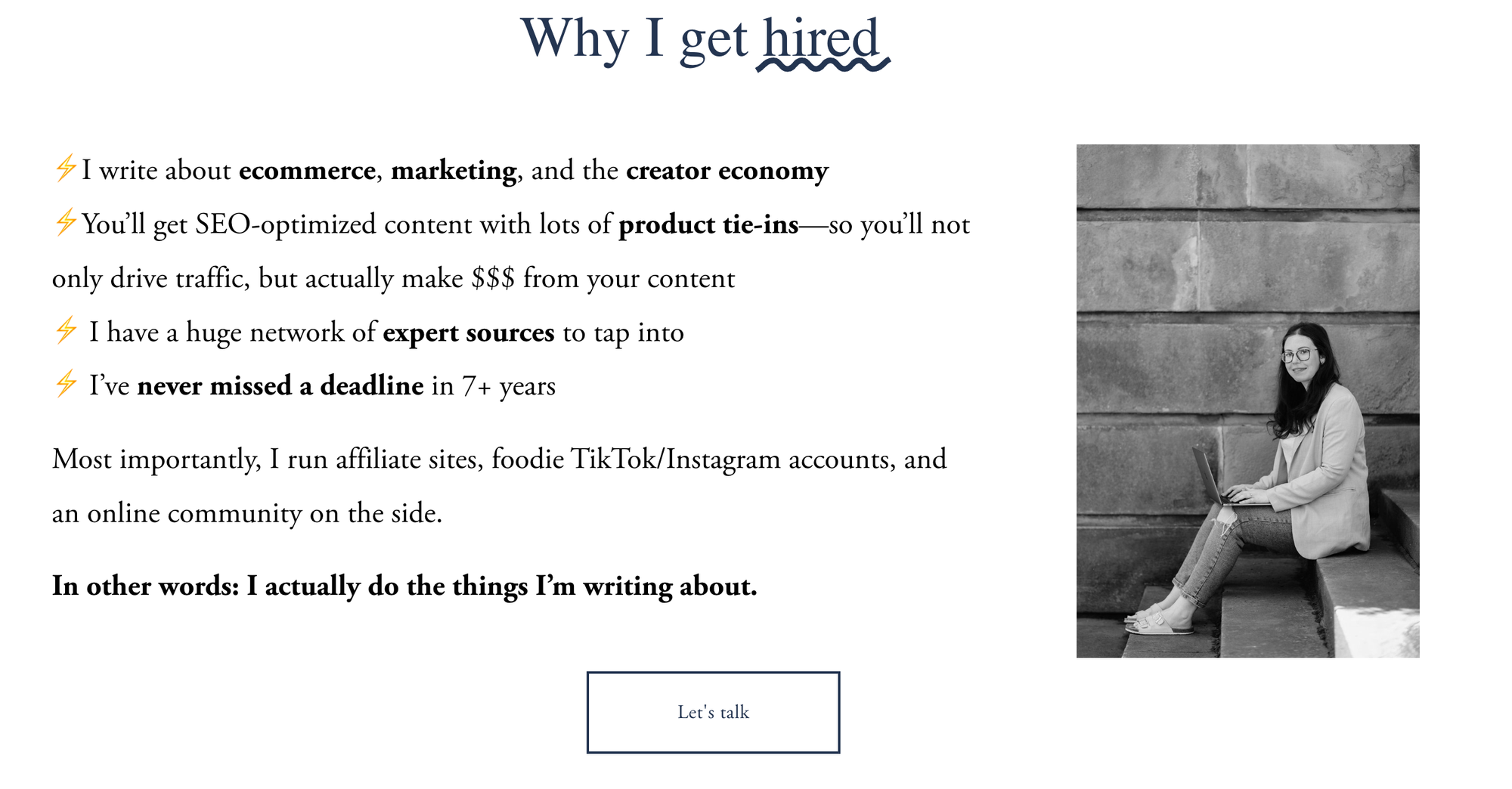 Next, Elise's "Why I Get Hired" section goes beyond a traditional “About Me” blurb by mixing accomplishments with personality. She highlights unique selling points, such as her SEO expertise, product tie-ins, and an unblemished track record for hitting deadlines. Adding a personal note about running affiliate sites and foodie TikTok/Instagram accounts makes her relatable and reinforces her real-world experience.
