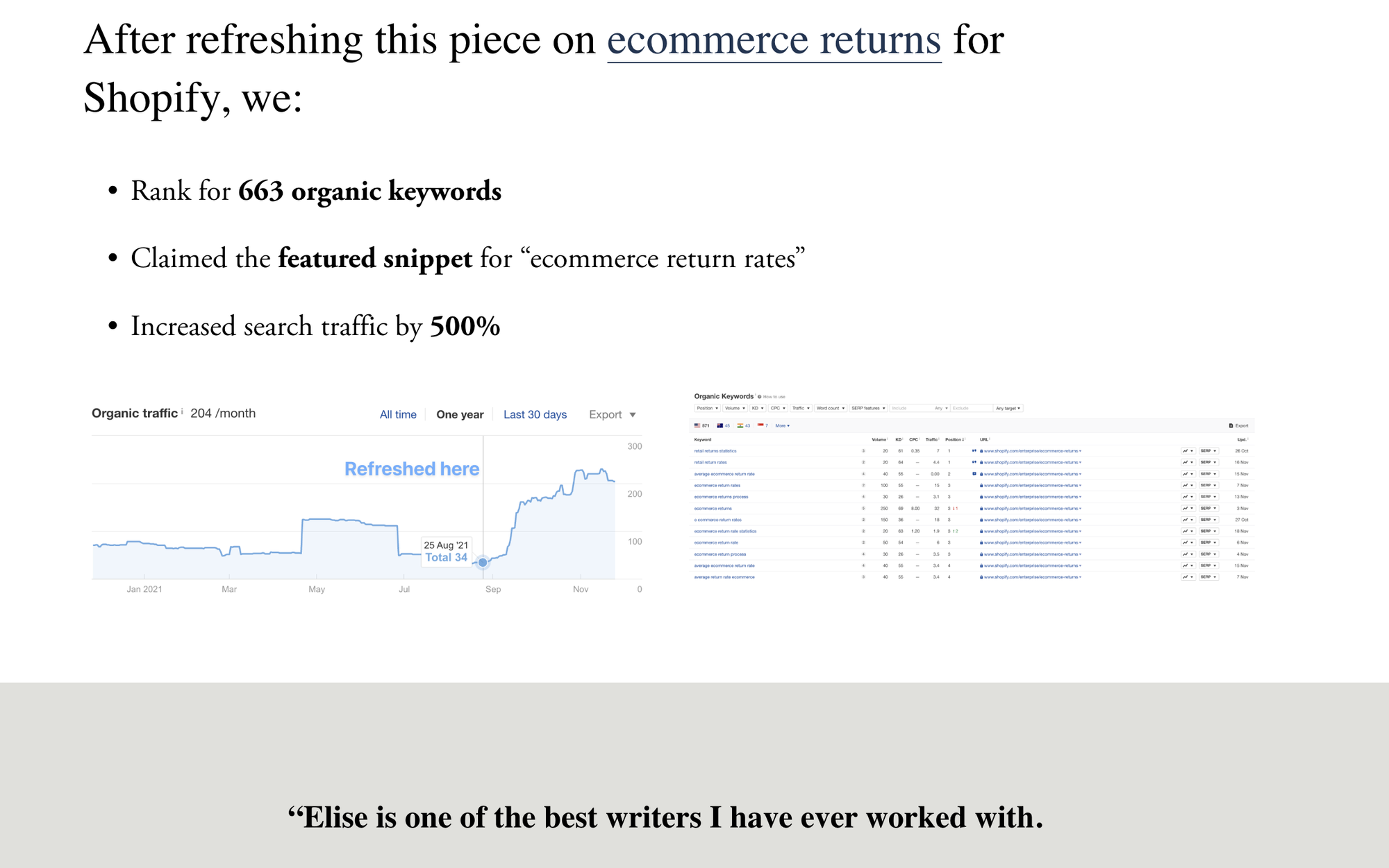 Elise’s portfolio doesn’t just describe her work; it shows the impact. For instance, in her Shopify content refresh, she includes tangible results. By pairing these metrics with a visual (traffic growth chart) and following them up with client testimonials, she makes her success undeniable.