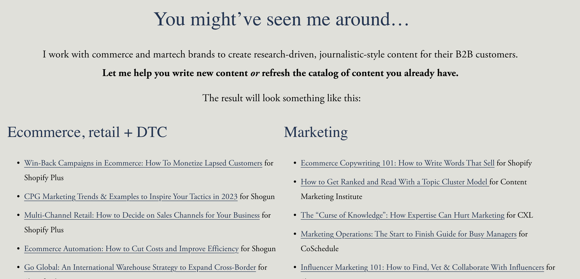 - Who you write for (Is your target audience B2B, B2C, or DTC? What industries or writing niches?)