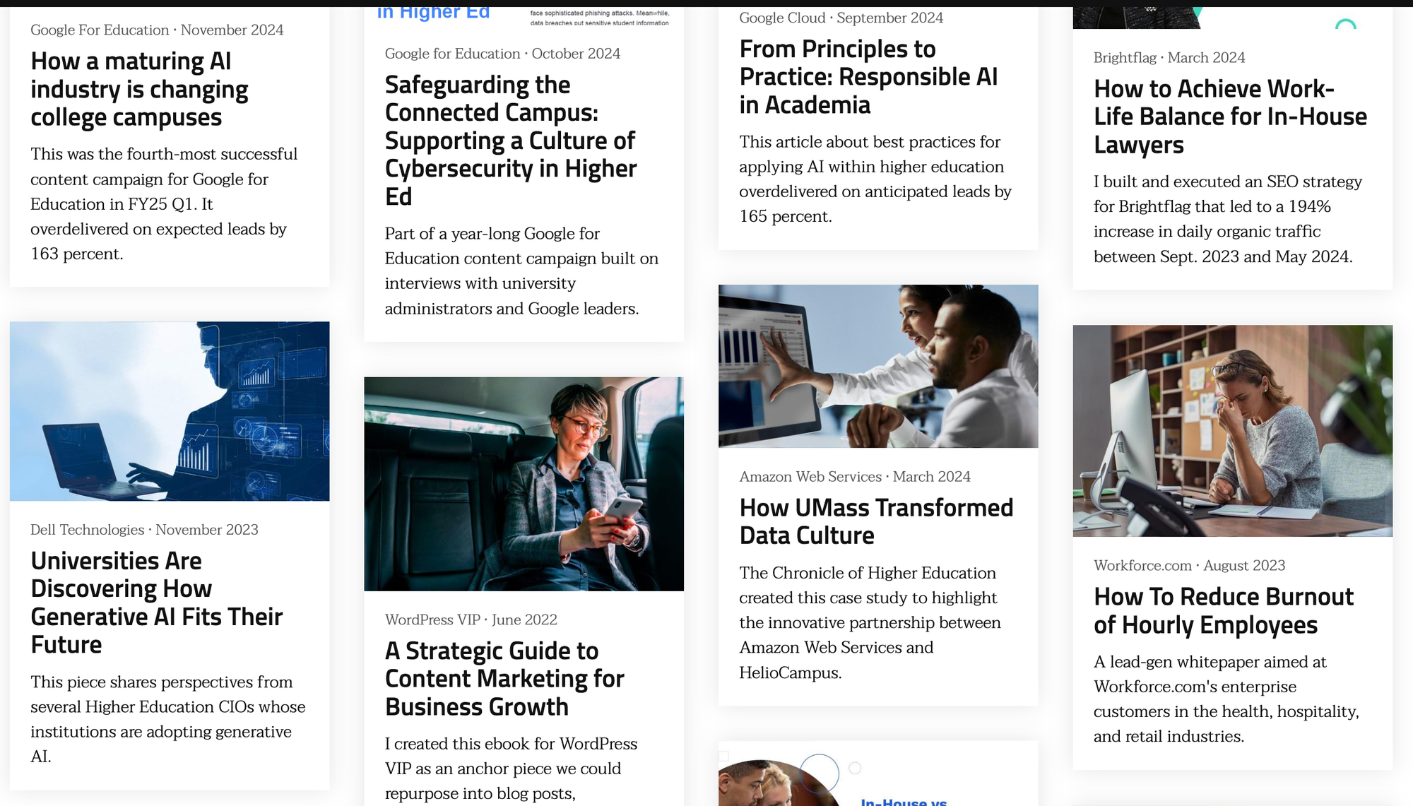 - “For this white paper, I worked closely with the client’s content marketing team and internal SMEs, translating complex technical topics into an engaging narrative.”